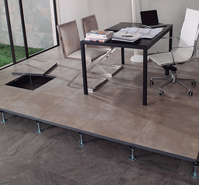 The RAF system from Butech is a type of raised technical flooring for projects where you need easy access to the services housed beneath the floor and also an easy and quick piece replacement. Indoor use. This type of flooring consists of a panel with ceramic covering and a galvanized steel frame.